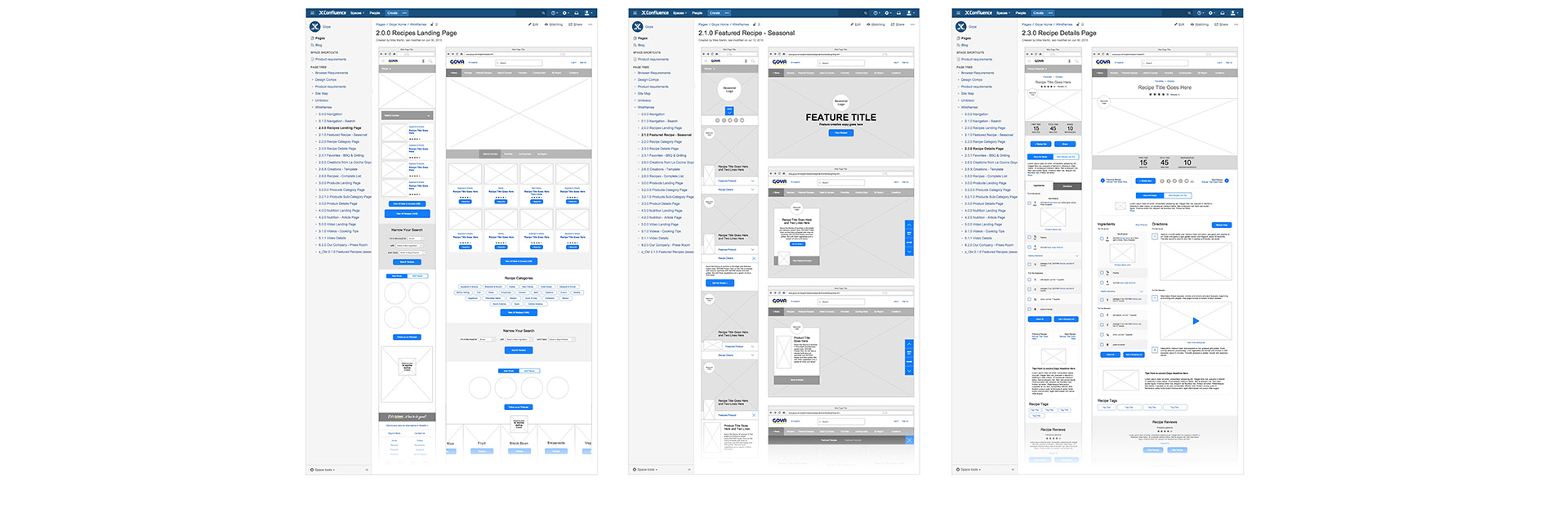 Goya.com has had great success over the past 8 years since its last redesign, as did the mobile site launched in 2011. Unfortunately, with the combination of Google’s new algorithims and the increase of mobile device usage worldwide, goya.com saw drops in its stronghold atop many of the most popular searches related to many of their primary products and most popular recipe categories. Using Atlassian’s Confluence, I mapped out new wireframes that incorporated many of the most popular features and content that gave their users the same experience and results that many of the top recipe sites and apps provide across all platforms, both in store and at home.