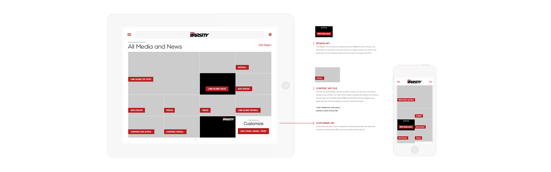 In 2014, I worked again with MSG Varsity and Cablevision to update the app with a full redesign and update the UX/UI as well as take advantage of new iOS features. Due to a shift in strategy, MSG Varsity wanted to focus more on new content and on regional sports news, but still allow users the same custom features from version 1. I achieved this by eliminating the individual custom cards and introducing a tile mosaic that used multipurpose tiles to display different types of static and custom APIs.