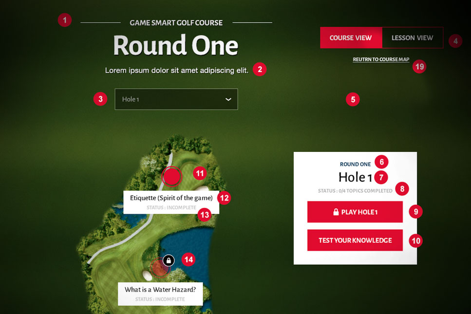 Guiding the users through the rules of golf in a game-like experience that combined the latest trends in e-learning and gamification allowed golfers with any knowledge and skill level to enjoy learning the rules of golf. To keep users engaged, I used recognizable golf imagery, such as scorecards, scoreboards and course designs to display progress and guide users through the content.